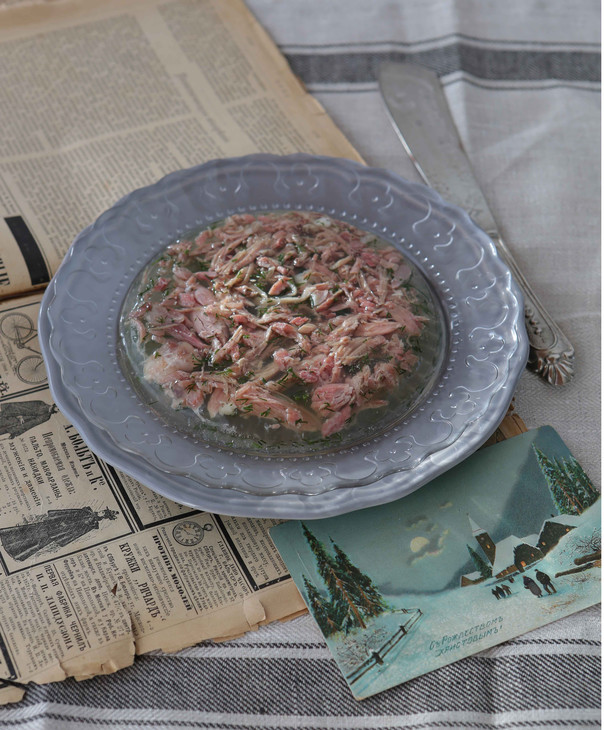В подготовленную тарелку выкладываем мясо, нарезанное произвольно и заливаем бульоном. Ставим в прохладное место для застывания.