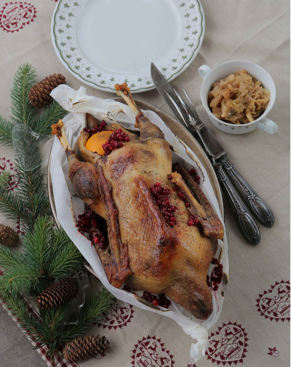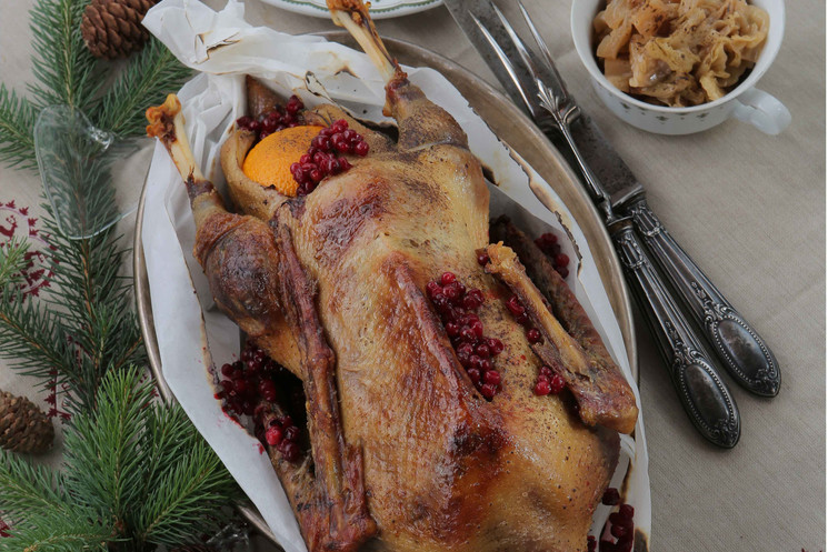 Потом вынимаем гуся из маринада и обсушиваем. Укладываем тушку в жаропрочную форму, плотно связав ноги и крылья нитками или узким бинтом. Заворачиваем гуся в фольгу и ставим в духовку, нагретую до 180 градусов, на 2,5-3 часа в зависимости от размера и возраста гуся. После первоначального запекания вынимаем блюдо из духовки, разворачиваем фольгу и вновь возвращаем гуся в печь для создания румяной корочки, предварительно полив жиром из противня. Готового гуся подаем на стол на подносе, украсив его зеленью и овощами по своему усмотрению и фантазии.