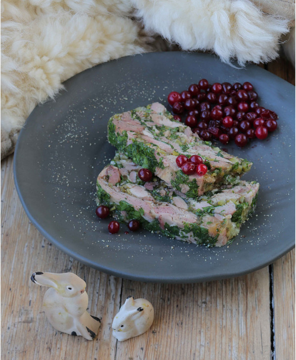 Смешиваем, мелко нарезанные каперсы, корнишоны, лук шалот и ветчину с небольшим количеством бульона. Смачиваем внутреннюю сторону формы для террина объёмом 1 литр и выкладываем девятью слоями пищевой плёнки.